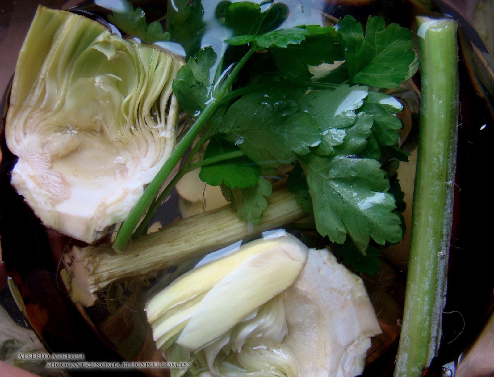 | Alcachofas a remojo con perejil. |